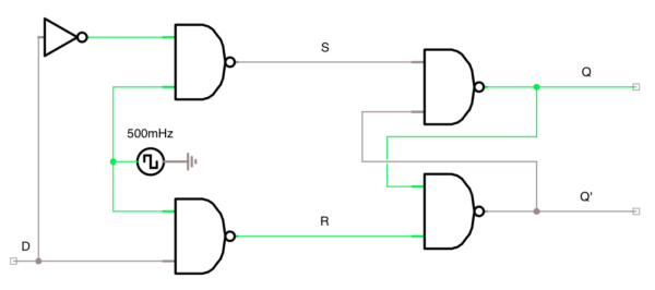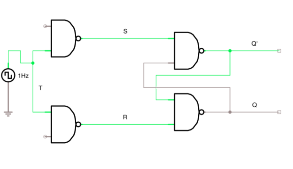 Utiliza dos compuertas NOR. S y R son las entradas, mientras que Q y Q’ son las salidas (Q es generalmente la salida que se busca manipular.)